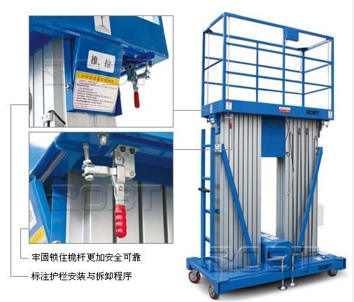 第二,铝合金升降平台的应用范围越来越广。常应用于工厂、工地、汽车、集装箱、模具制造、木材加工、化工罐装等行业企业,能满足不同工作高度的升降量要求,同时可配有各类台面形式,多种控制模式,具有升降平稳准确,载重大等特点,高效地解决了工业企业的各种提升操作的困难,使生产作业轻松自如。但各铝合金升降平台具有自身的极限载荷能力,超过极限承载能力时,铝合金升降平台不但会受到损坏,而且有时还会造成人身伤害。因此,铝合金升降平台在使用前都要进行重量检测,以保证铝合金升降平台在额定载荷范围内的正常工作。因此一般用户在超重时往往不是员工不注意,如果铝合金升降平台没有专人操作和看管,最好装上载报警装置,这样也能提醒工人不要超载,既保证铝合金升降平台的安全,又能起到警示作用。